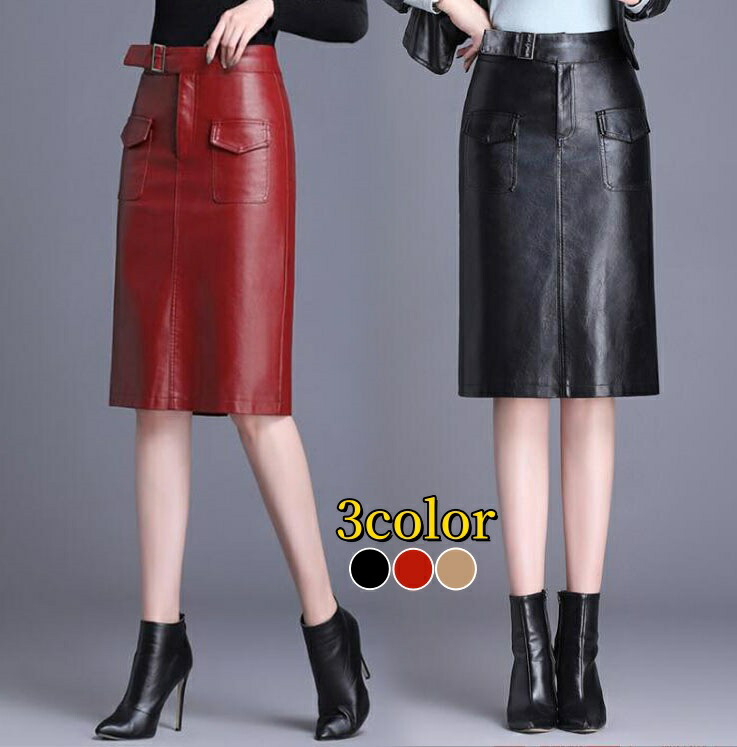 3色 スカート レディース レザースカート ミディアム丈 フェイクレザースカート ハイウエスト タイトスカート 無地 スリットスカート ペンシルスカート 脚長 シンプル スリム 美脚