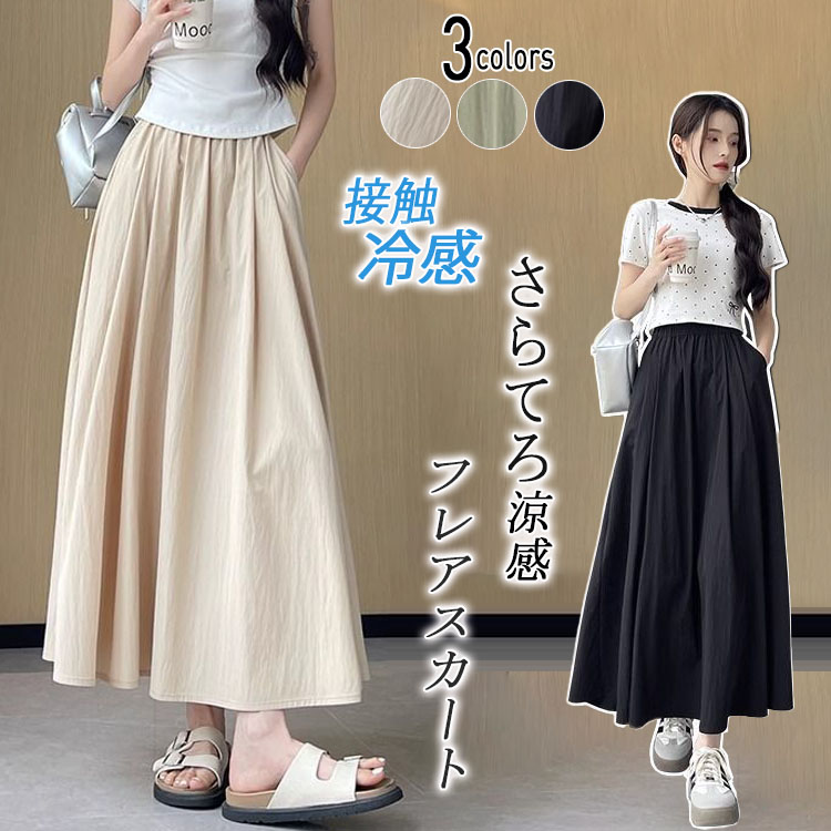 涼感 フレアスカートギャザー 着痩せ ライン スカート レディース 春 夏 秋 無地 カジュアル おしゃれ 海 夏