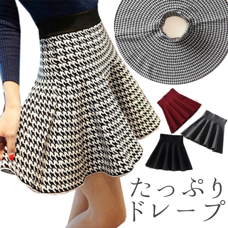 たっぷりドレープのフレアスカート サーキュラースカート ミニ ミニスカート 円形 スカート 大きいサイズ ウエストゴム チェック 千鳥格子 ウール 無地