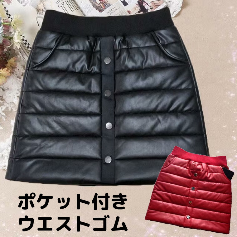 ウエストゴムで重ね着も簡単 ポケット付き中綿合皮ミニスカート フェイクレザー ゴム あたたか あったか ぽかぽか 防寒 キャンプ アウトドア ミニ ポケット ファスナー レイヤード 膝掛 中綿 重ね着