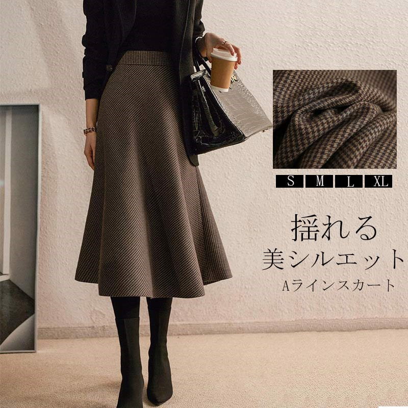 スカート レディース ボトムス ロングスカート 膝下 ひざ下 フレア チェック柄 スカート 千鳥格子 ラインスカート きれいめ ゆったり ハイウエストスカート スカート 大人 上品