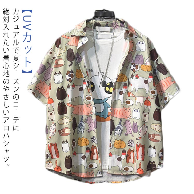 可愛い 猫柄 半袖シャツ アロハシャツ 通気速乾 ビーチシャツ メンズ 夏服 カジュアル おしゃれ 薄手 ゆったり