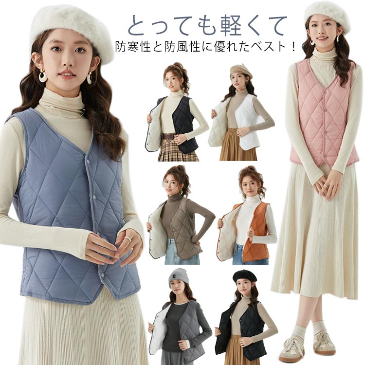 ダウンベスト レディース 前開き ベスト インナーダウン 中綿 中綿ベスト ノースリーブ キルティング ライトダウン ウター 軽量 防寒 暖かい 着痩せ 秋 冬 型カバー