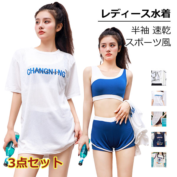 スポーティー水着 レディース 水着 半袖ラッシュガード フィットネス 体型カバー 3点セット タンキニ セパレート 可愛い 冷房対策 学生 大人 水泳 スポーツ風 速乾 ショートパンツ aaa 練習用