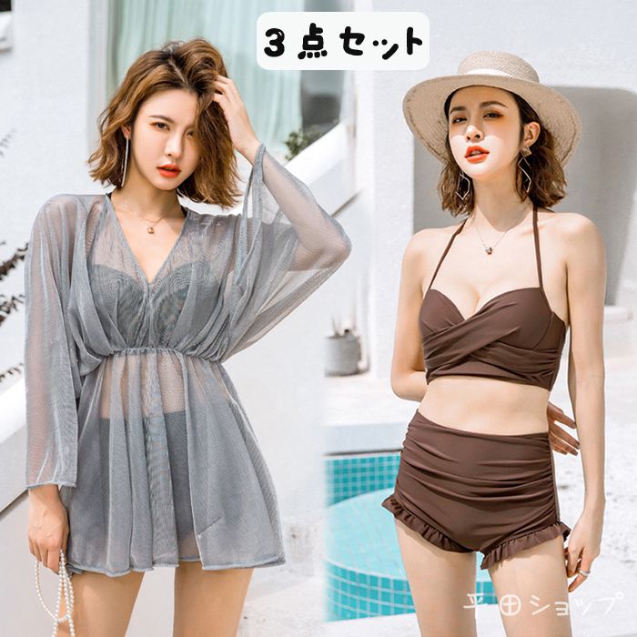 水着 レディース ビキニ 3点セット 体型カバー 花柄 長袖 トップス付き セパレート 可愛い ハイウエスト シースルー ワンピース 羽織り 20代 30代 40 女性
