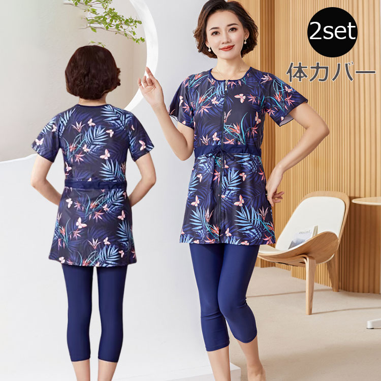 フィットネス水着 セパレート水着 レディース セットアップ ワンピース レギンス 中高年 お母さん 大きいサイズ 体カバー 露出控えめ おしゃれ 総柄 ネイビー ウェスト調節可 母の日 敬老の 伸縮性