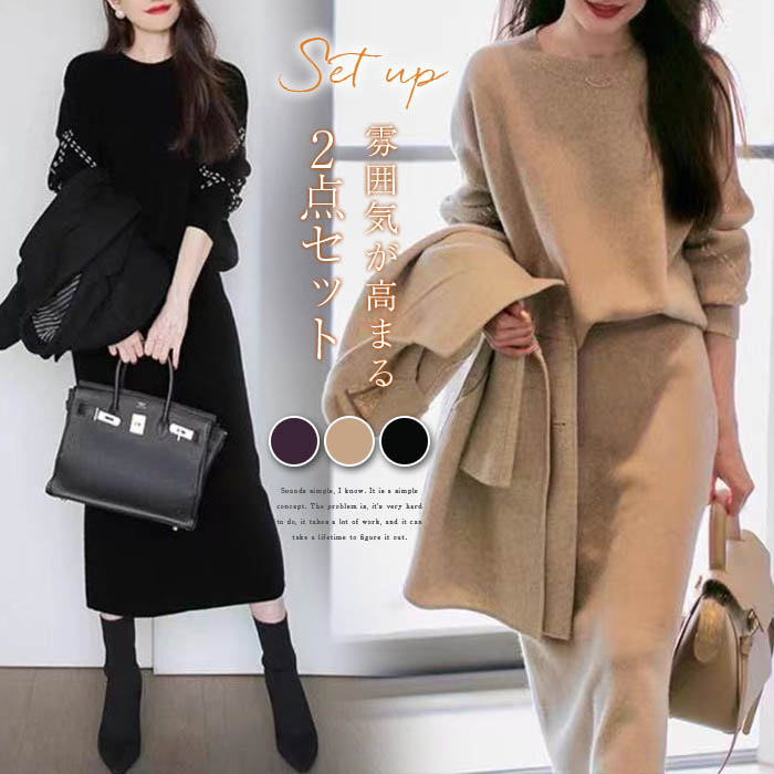 ニットセットアップ 韓国 スカート セーター きれいめ 長袖 レディース 秋冬ニットスカート セットアップ ロング丈 2点セット オフェス ニットスカート 無地 エレ ニットセット