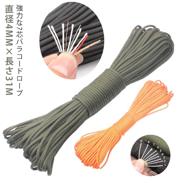 パラシュートコード ロープ 31m 強力 4mm キャンプ用品 首輪 テントロープ ガイドロープ 7芯 ハンドメイド ブレスレット 犬 パラコード ガイロープ タープロープ 防災グッズ リード