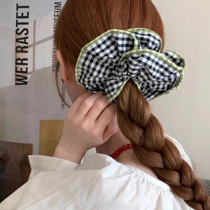 ビッグシュシュ フリル ギンガムチェックボリュームシュシュ ヘアゴム レデイースヘアアクセサリー おしゃれ 大人可愛い バイカラー