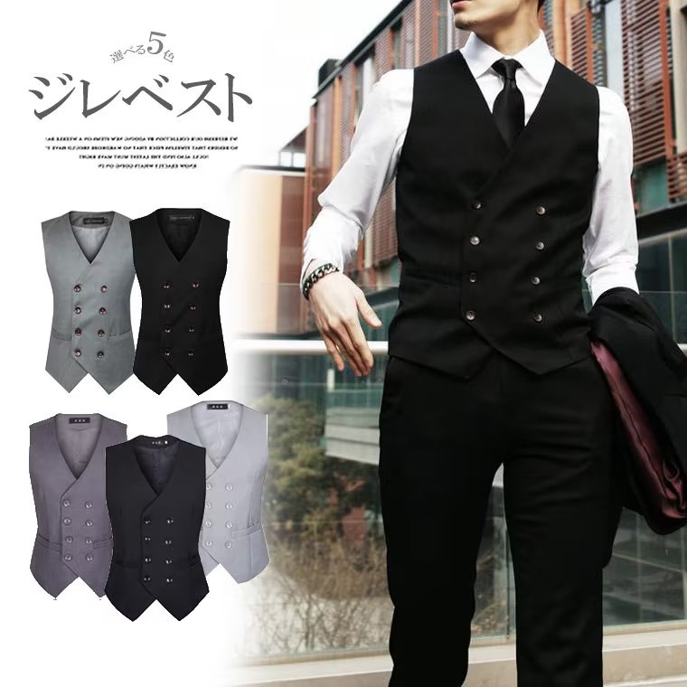 スッキリとしたシルエット ダブルボタン ジレ メンズ ベスト スーツ地 チョッキベスト キレイ目 スリム 細身 S-6XL 大きいサイズ ウエスト調整ベルト
