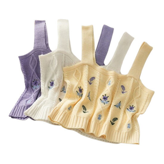 花柄ニットビスチェフラワー白ホワイトイエロー黄色紫パープルショート丈短い短めダンス衣装ヒップホップHIPHOPレディースガールズkpop大人おしゃれかわいいキャミソールタンクトップ韓国刺繍