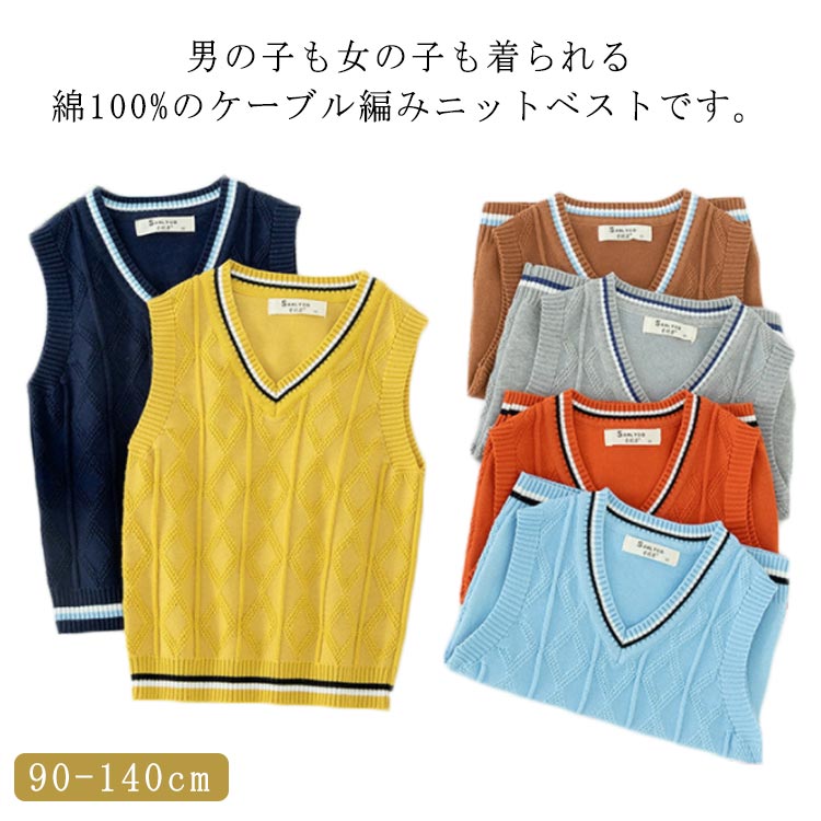 キッズ 子供服 女の子 男の子 ユニセックス 赤ちゃん ニットベスト ネック ケーブル編み 無地 スクール ニット ベスト 幼児 入園式 入学式