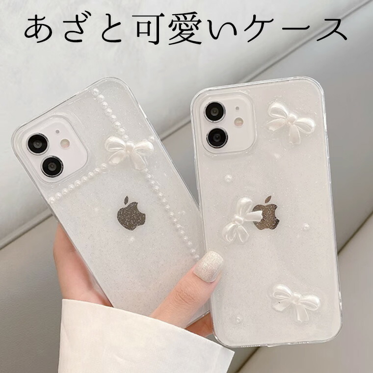 あざと可愛い リボンとグリッター ホワイト iphone15対応 白 iphoneケース iphoneカバー シンプル キラキラ パール ビジュー ビーズ 透明 半透明 シアー クリア