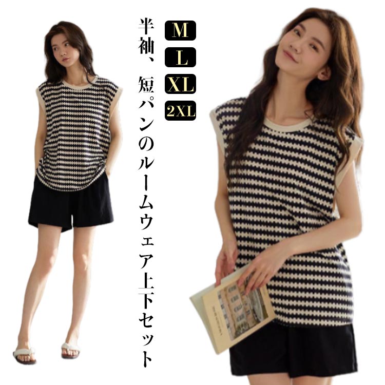 レディース パジャマ ショートパンツ ノースリーブ 半袖シャツ カップ付き ルームウェア ショートパンツ 短パン リラックスウェア 柔らかい 可愛い ボーダー柄