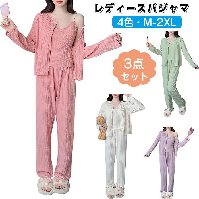 レディースパジャマ 3点セット カーディガン付き ナイトウェア レディースホーム服 部屋着 上下セット キャミソール 長袖 敏感肌 やさしい 保温 通気