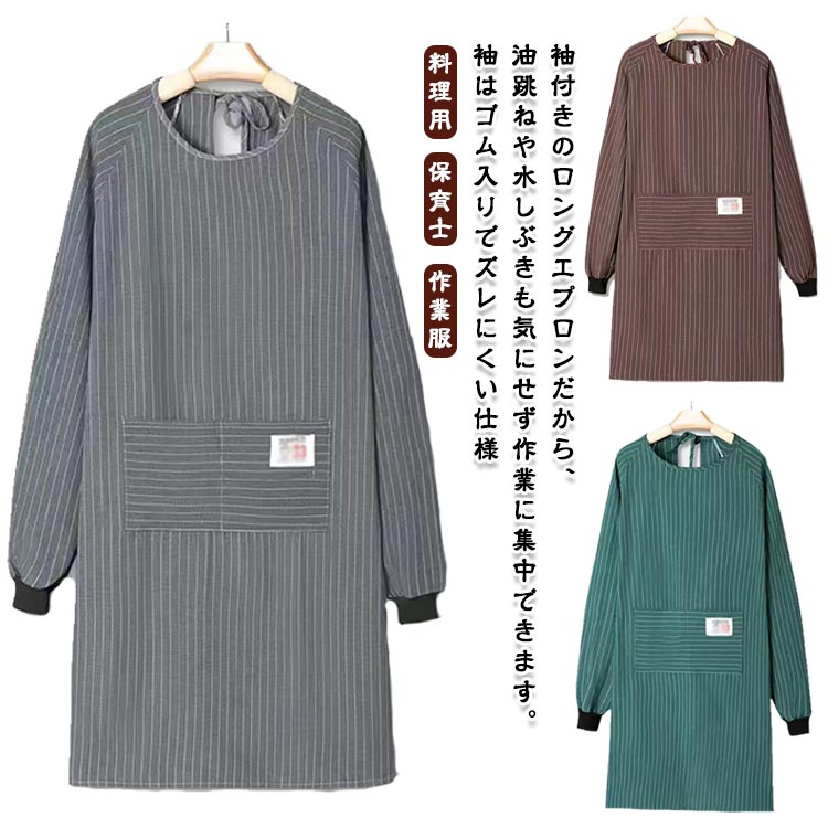 2枚セット 着丈は約95cm エプロン 長袖 袖付き 割烹着 おしゃれ 大人用 スモック 大きいサイズ レディース ロング 北欧 ストライプ柄 介護士 保育士 飲食店 ポケット付き