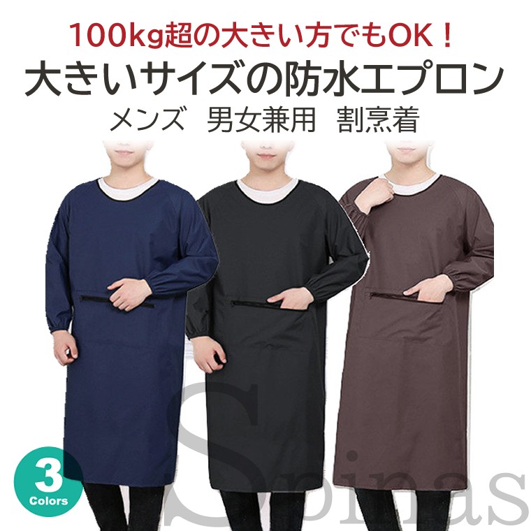 体重100kg超でもOK 大きいサイズの防水エプロン メンズ 男女兼用 割烹着 袖あり 長袖 ポケット付 作業エプロン 無地 シンプル ユニセックス スモック
