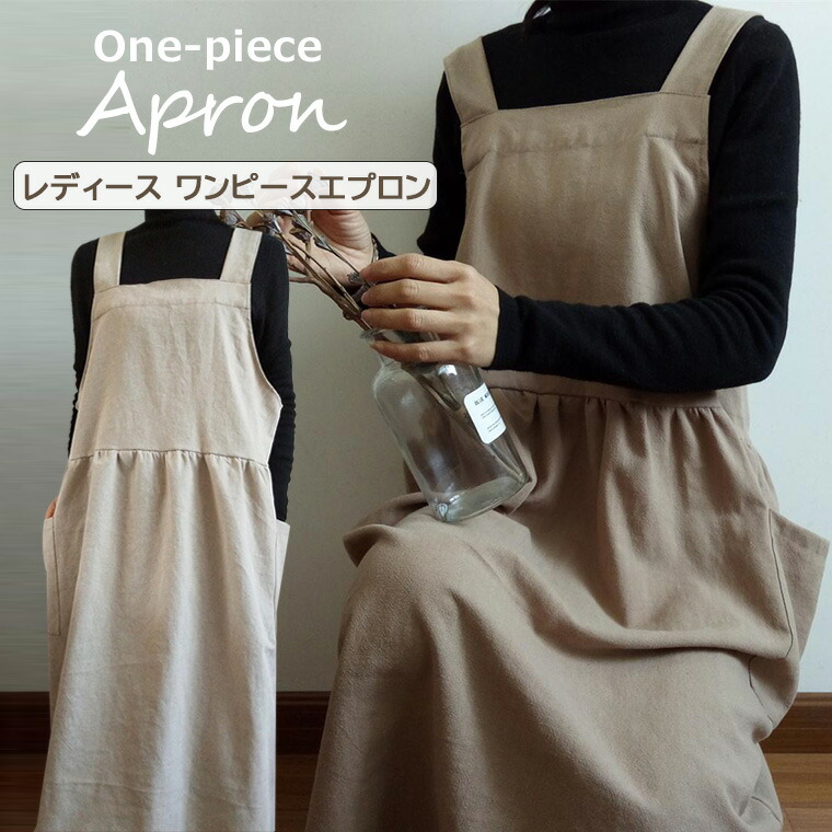 エプロン ワンピース 106cm丈 ナチュラル 北欧風 シンプル おしゃれ レディース 可愛い ポケット ギャザー切り替え 無地 お料理教室 ガーデニング ゆったりシルエット 全2色 カフェ