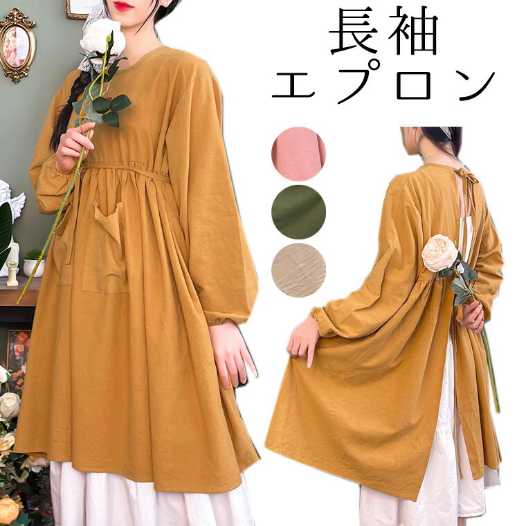 ワンピースのような長袖エプロン 割烹着 ン カフェエプロン 型 ボタン チュニックエプロン ワンピース かぶる ワークエプロン 北欧風 ミドル