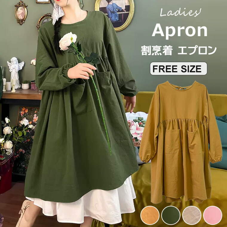 エプロン ワンピース 106丈 ナチュラル 北欧風 シンプル おしゃれ レディース 可愛い ポケット ギャザー切り替え 無地 お料理教室 ガーデニング ゆったりシルエット 全2色 カフェ