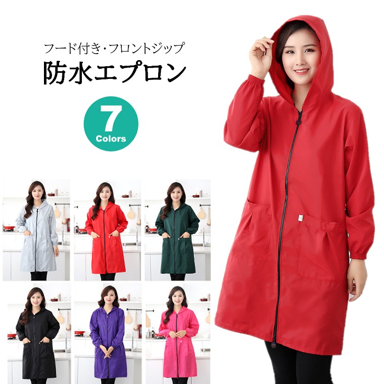 前開き 防水スモックエプロン 割烹着 フード付き エプロン 長袖 シンプル 無地 ワンピース風 ジッパー ポケット ゆったり ロング丈 おしゃれ