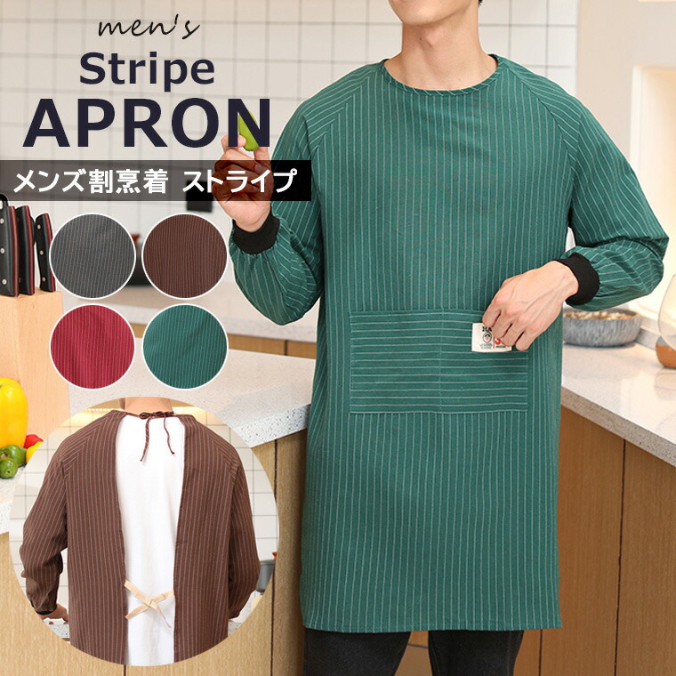 エプロン かっぽう着 94cm丈 ストライプ柄 おしゃれ メンズ 可愛い ポケット シンプル ラグランスリーブ 保育士 キッズ ガーデニング ゆったりシルエット 全4色 介護士