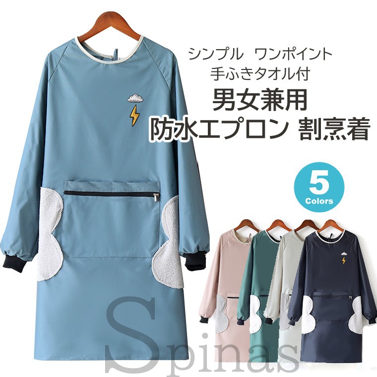 稲妻のワンポイント 手拭きタオル付き 防水エプロン 男女兼用 割烹着 袖あり 長袖 ポケット付 スモック シンプル ユニセックス 作業エプロン