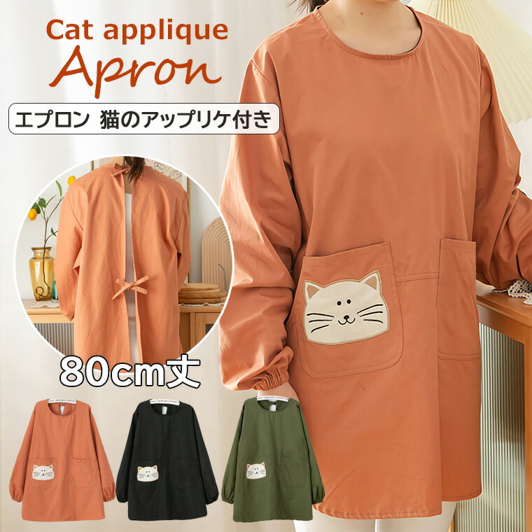 エプロン かっぽう着 80cm丈 猫のアップリケ ワンピース おしゃれ レディース 可愛い ポケット シンプル 無地 保育士 キッズ ガーデニング ゆったりシルエット 全3色 介護士