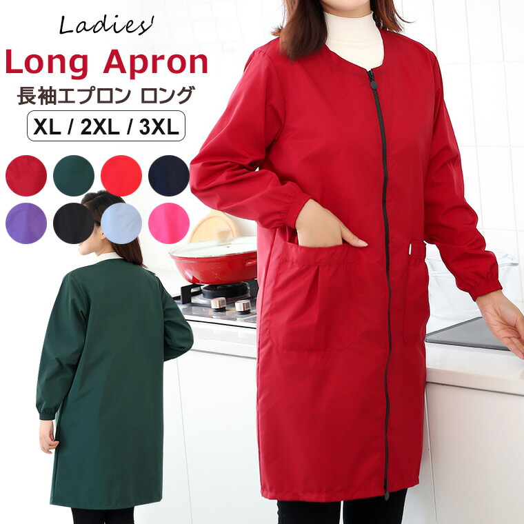 撥水加工で汚れにくい前開きタイプのロングエプロン♪ 前開き 長袖エプロン ロング レディース 長袖 かっぽう着 フロントジッパー 袖口ゴム 防水 はっ水 98 割烹着 全8色 ロング丈