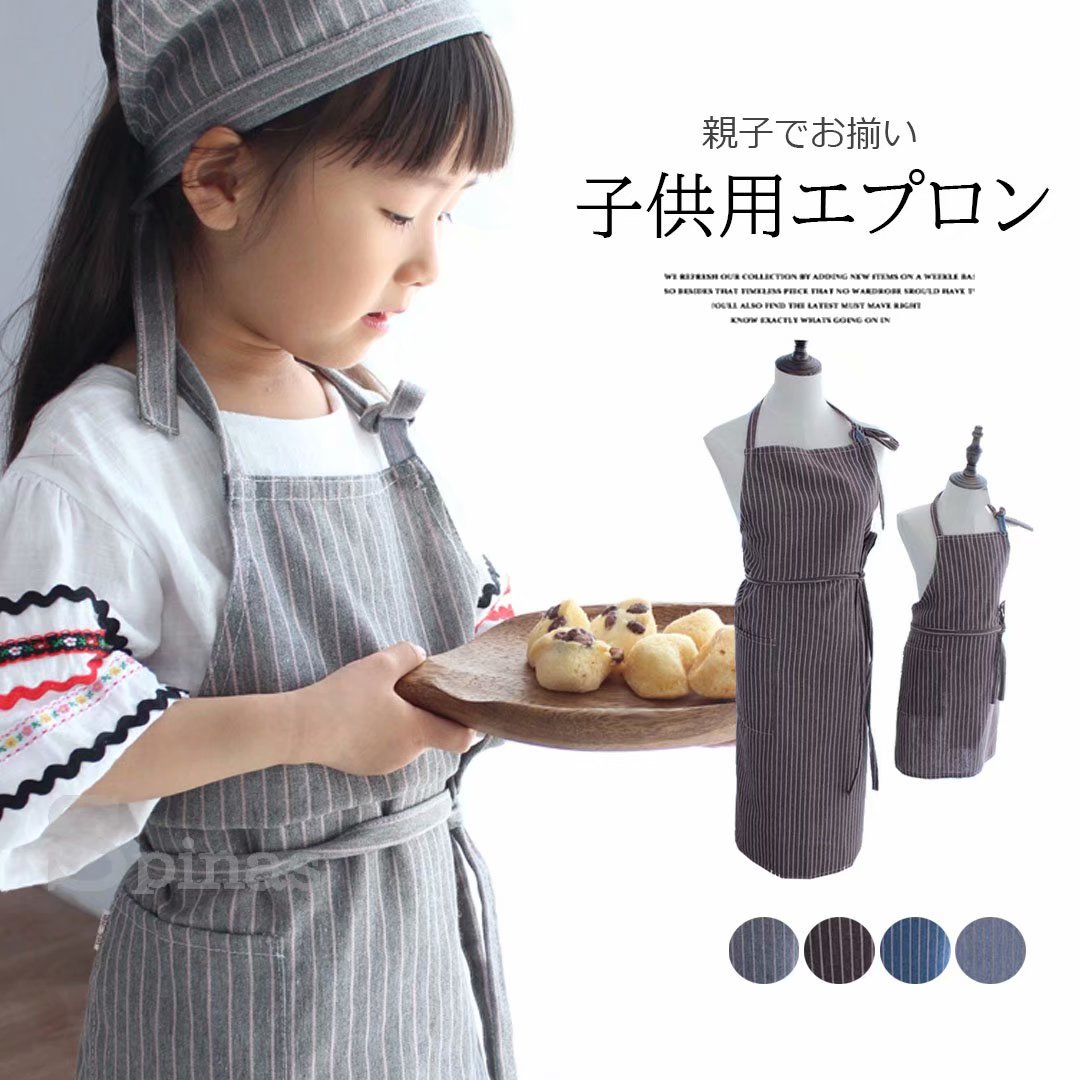 親子お揃い 大人用 子供用 エプロン キッズ ストライプ柄 ナチュラル お揃い 首掛けエプロン 4色 ペアコーデ
