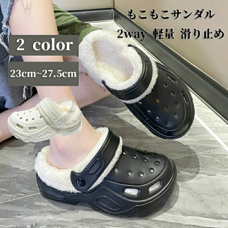 もこもこサンダル ボア クロッグサンダル スリッパ 厚底 サンダル 暖かい 冬 冬用 EVA素材 つっかけ 可愛いおしゃれ 2wayベルト 軽量滑り止め 単色 ホワイト ベランダ ジム ビー ブラック