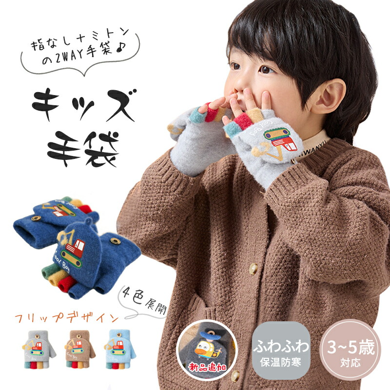 手袋 キッズ ミトン 男の子 2way 防寒 かわいい パワーショベル ヘリコプター キッズ手袋 子供手袋 子ども手袋 ミトン手袋 子供用 グローブ 指切り もこもこ 暖かい 4歳 5歳 雪遊び 3歳