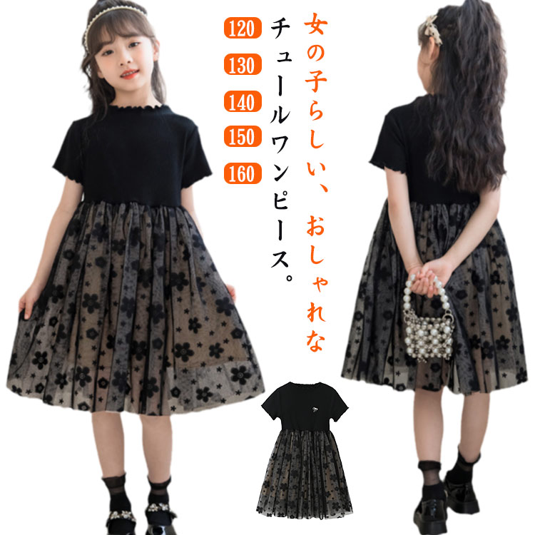 ワンピース 子どもワンピース チュール フォーマル 花柄 黒 半袖 ドレス 子供 シンプル チュールドレス 子供服 フリル キッズワンピース ピアノ発表会 入園式 二次会 入学式 パ 卒業式