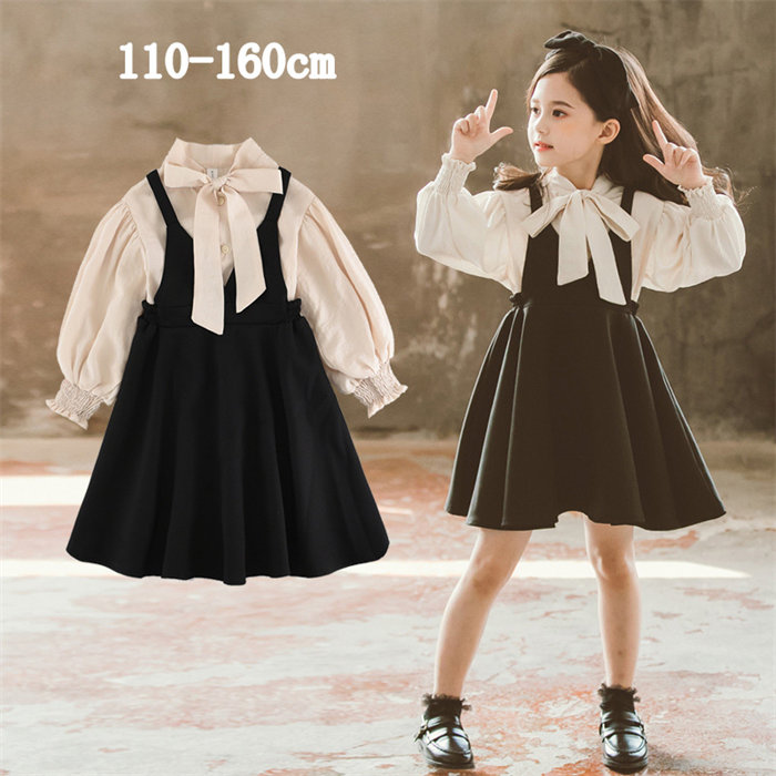 送料無料 キッズ ワンピース サロペット風 ワンピース 女の子 ベビー服 長袖 キッズ レイヤード風 シンプル 上品 膝丈 かわいい バルーン袖 ワンピース 春 秋