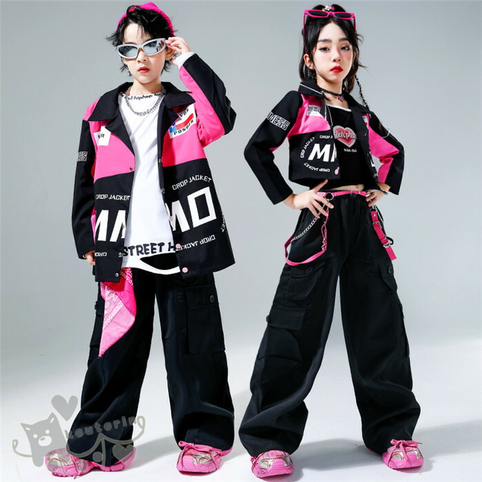ダンス衣装 ヒップホップ 文字柄 インナーップ ジャケット カーゴパンツ キッズダンス衣装 ガールズ 男の子 派手 K-POP 韓国 ステージ衣装 応援団 体操服 発表会 hip 練習着