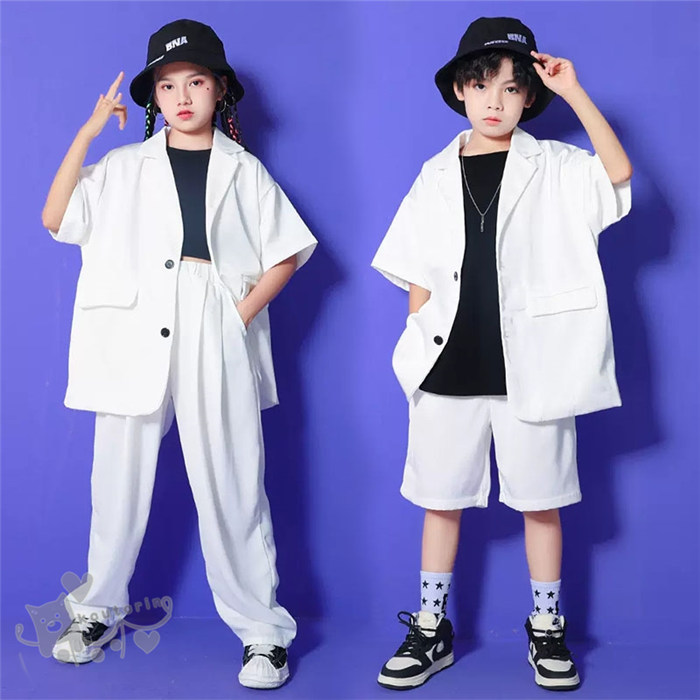 キッズダンス衣装 ヒップホップ スーツ 半袖ジャケット ショートorロングパンツ ガールズ 男の子 派手 K-POP 韓国 白ステージ衣装 練習着 体操服 発表 応援団