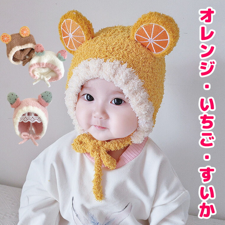 フルーツが耳のようについたかわいい帽子 ふわふわ もこもこ いちご オレンジ すいか 輪切り くま クマ ベア うさぎ ねこ耳 ネコ耳 みみ付 ニット帽 帽子 とんがり帽子 耳付き