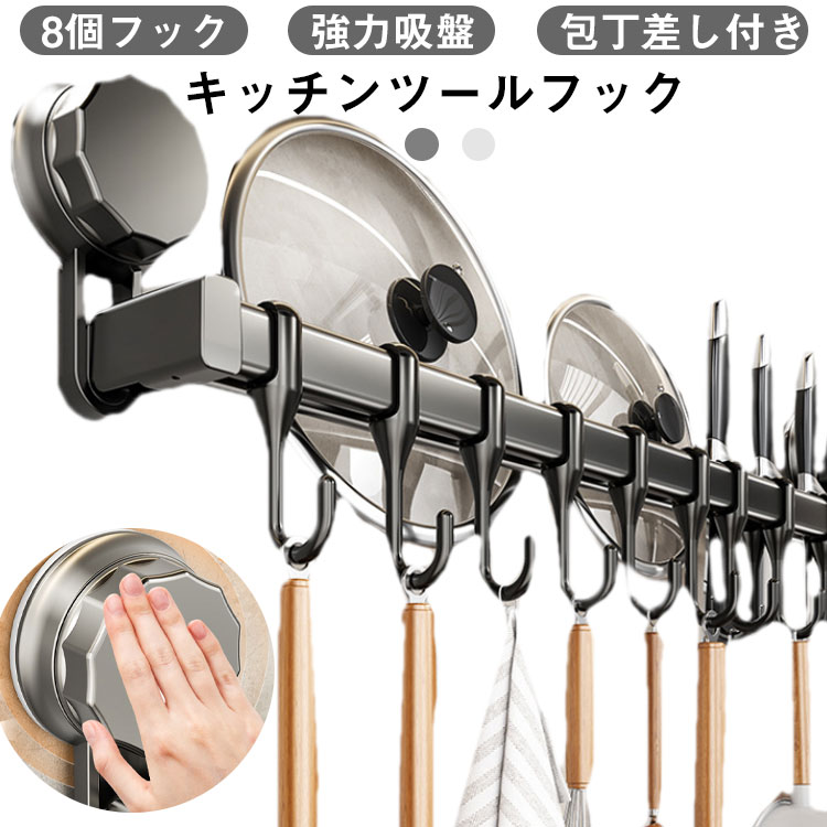 キッチンツールフック 壁掛けフック 強力吸盤ダブルバー 可動式フック 吸盤式 キッチンラック 8個フック 40cm 6個フック 30cm 強力吸着 キッチンツール収納 調理器具 鍋 穴あけ不要
