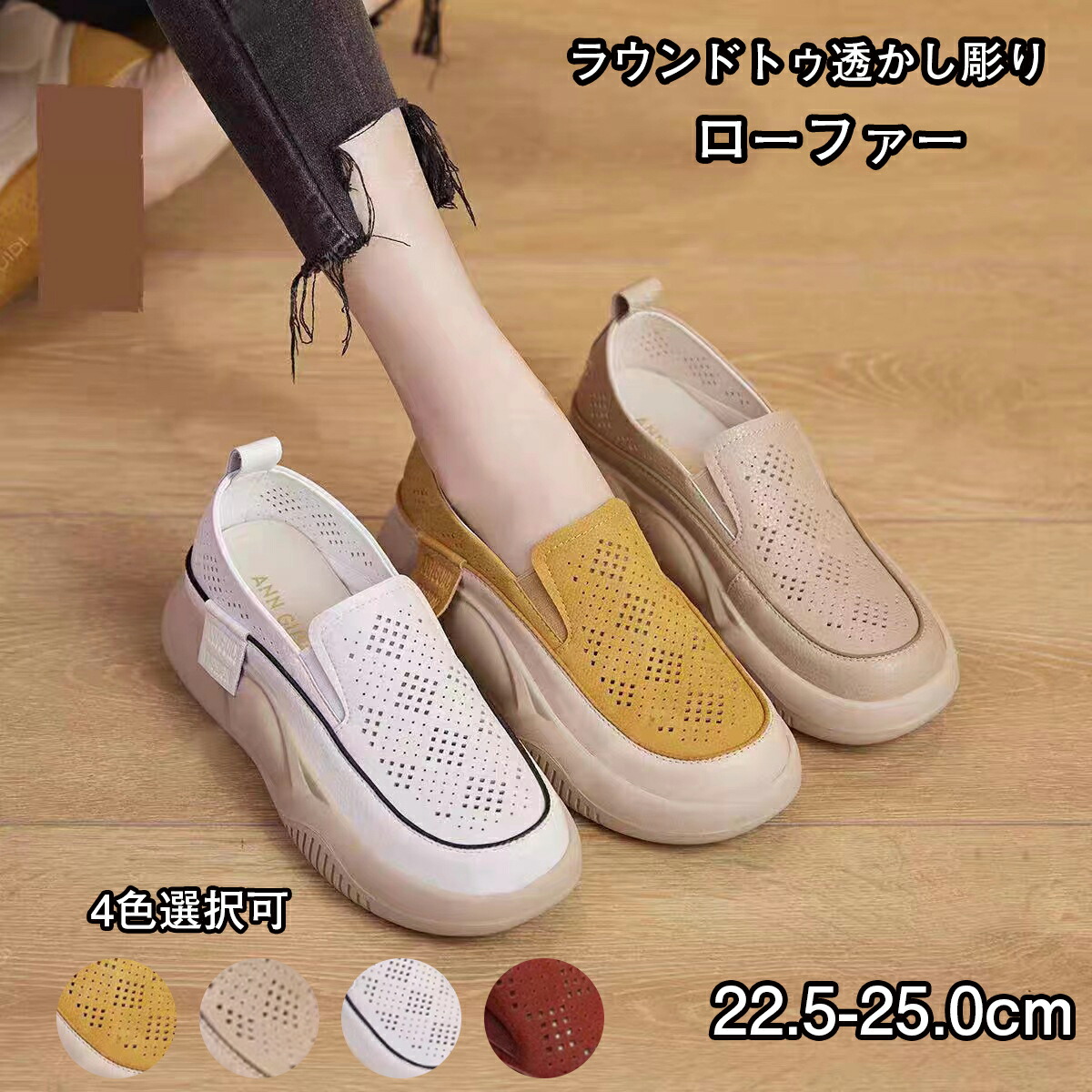 レディース スニーカー 紐なし 厚底カジュアルシューズ ラウンドトゥ透かし彫りローファーレーディスシューズ