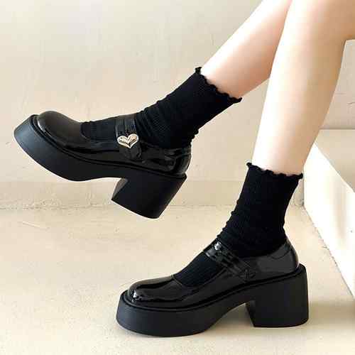 ラウンドトゥPUレザー靴 歩きやすいメイド靴 軽量メリージェーンシューズ お嬢様パンプス黒 厚底5cm プラットフォーム 身長盛れ靴痛くない ドレスシューズ脚長 エナメルコスプレ靴