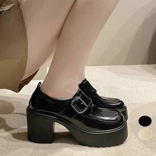 ワンベルトバックル ローファー 歩きやすいラウンドトゥシューズ メイド靴 美脚脚長お嬢様パンプス ヒール9cm疲れない 厚底靴 履きやすいシューズ 学院風ローファー黒 身長盛れ靴