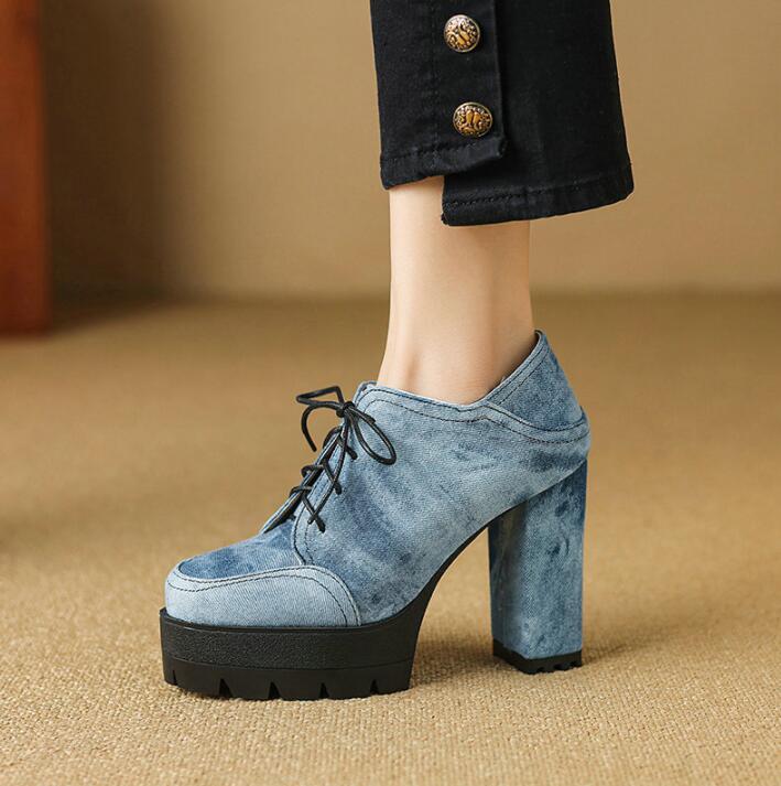 厚底ローファー デニムパンプス フォーマル レディース レースアップ 厚底スニーカー 太ヒールローファー 厚底靴 歩きやすい 美脚 滑り止め 安定感抜群通勤 通学 カジュアル 履きやすい