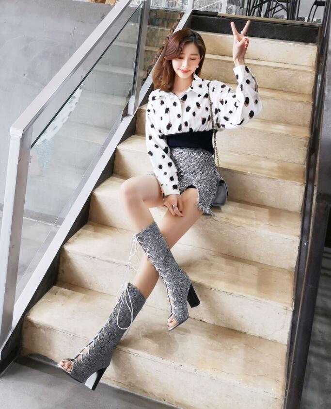 サマーブーツブーツサンダルロングブーツ編み上げブーツハイヒールサンダル夏キラキラ9センチヒール透かし長脚効果ブーツサンダルレディース靴夏ブーツ