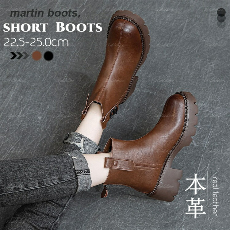 本革ブーツ サイドジップ 裹起毛 厚底ブーツ ショートブーツ レディース ショート丈 歩きやすい 疲れない ブーツ ブラウン ブラック 大きいサイズ 秋冬 履き口 6.5cm Heel 22 ゆったり