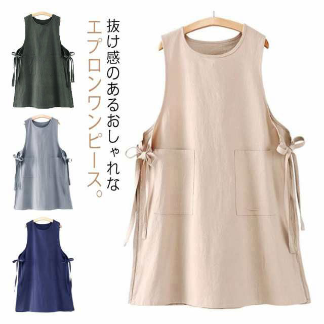 エプロンワンピース ノースリーブ ミドル丈 ポケット付き エプロンドレス 大きいサイズ レディース コットン おしゃれ ドレスエプロン 側スリット入り 可愛い 割烹着 北欧 幼稚園 美容師 保育 無地