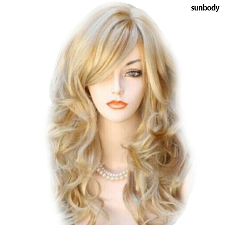 送料無料 ウィッグ 金髪 ハイライト フルウィッグ ミディアムカールウィッグ ツイストロングウェーブ 横流し前髪 エクステ セミロング ベージュカラー ふんわり