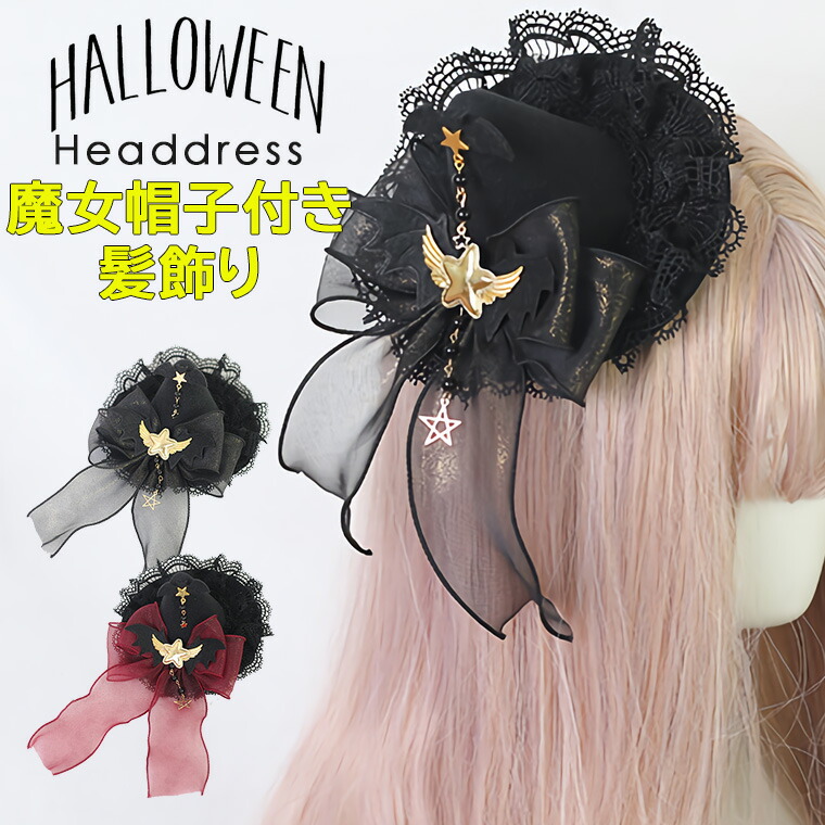 ハロウィン衣装にピッタリな魔女帽子付き髪飾り♪ レディース 髪飾り 魔女帽子付き レース こうもり ゴールド星 クリップタイプ ハロウィン アクセサリー ヘアアクセ 全2色 ヘアアクセサリー