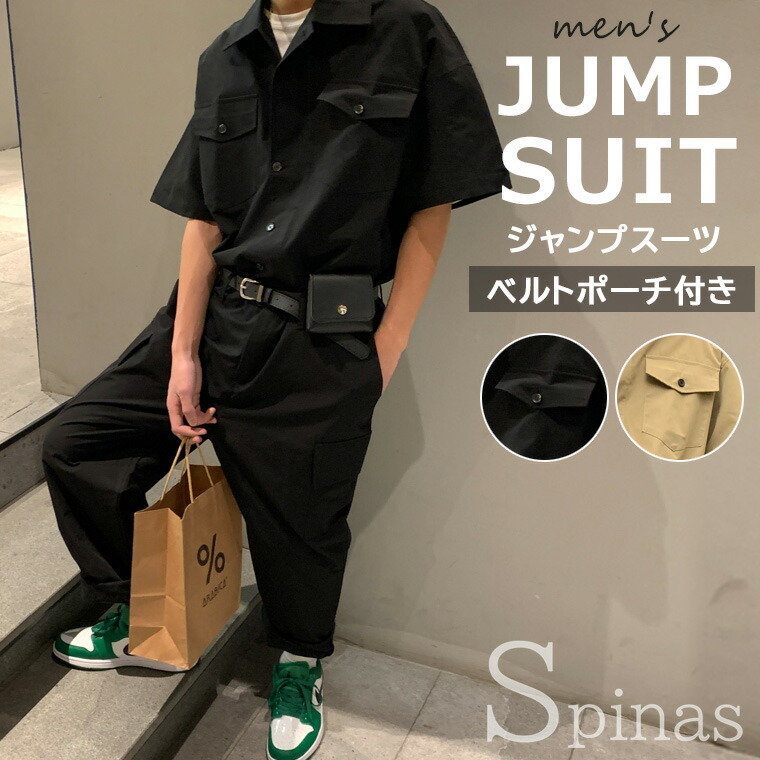ジャンプスーツ オーバーオール オールインワン つなぎ メンズ 半袖つなぎ ベルトポーチ付き シンプル おしゃれ 2色 ブラック カーキ レイヤードコーデ