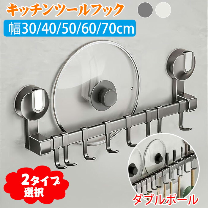 キッチンツールフック 吸盤 フック 強力 アルミニウム キッチンラック 防水防錆 キッチン収納 調理器具 鍋蓋置き キッチンツール 収納 壁掛け 可動式フック 傷つけない 40cm 8個フック 壁