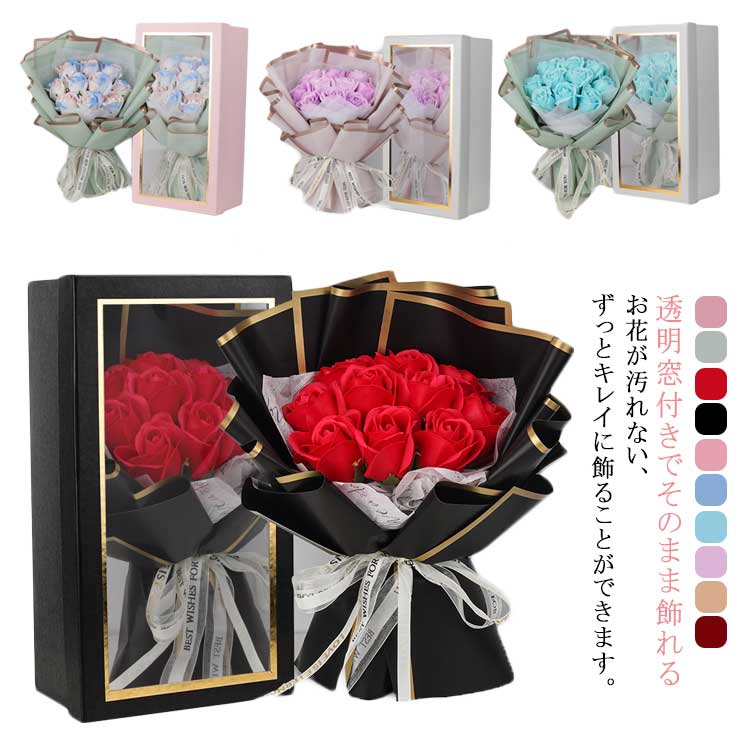 箱入り ホワイトデー バレンタインデー ソープフラワー ほこりよけ 母の日ギフト 造花 花束 結婚記念日 ローズブーケ お誕生日 敬老の日 新築祝い お見舞い 透明窓付きでそのまま飾れる